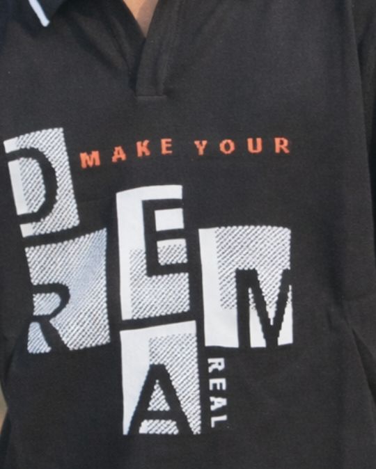 Trendy t-shirt featuring eye-catching bold typography print on the front. Designed with contrast collar piping and stylish sleeve edges, offering a modern street-style look. Perfect for casual wear and everyday fashion.