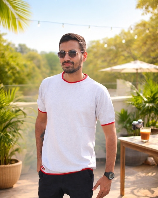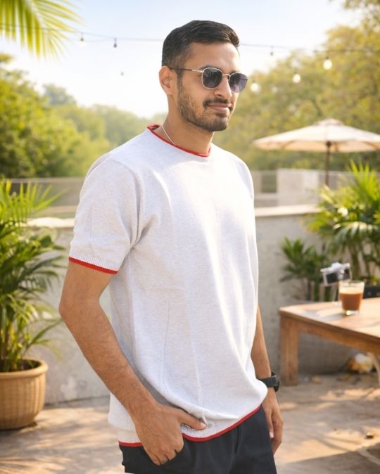 Men’s Classic Knit Round Neck T-Shirt with Red Ribbed Neck & Sleeve