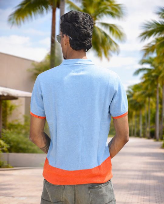 Premium men’s polo t-shirt in sky blue shade with stylish color block panels on the front. Designed with soft textured fabric, ribbed collar, and contrast sleeve edges for a smart casual look. Ideal for daily wear and weekend outings.