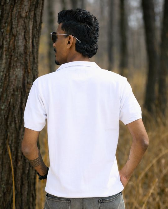 Men’s Solid Ribbed Polo Knit White T-Shirt