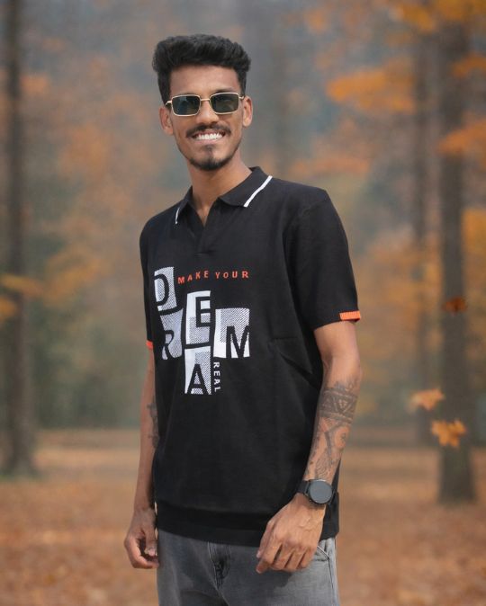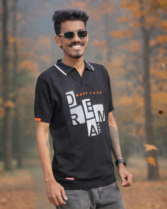 Trendy t-shirt featuring eye-catching bold typography print on the front. Designed with contrast collar piping and stylish sleeve edges, offering a modern street-style look. Perfect for casual wear and everyday fashion.