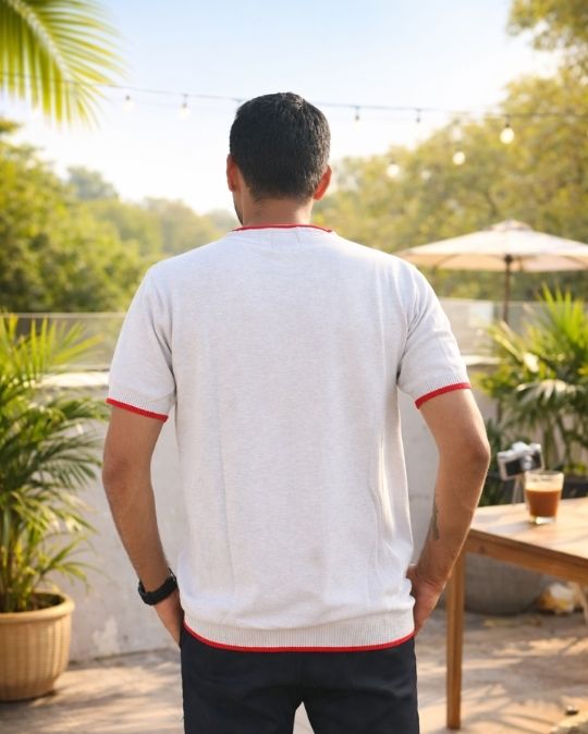Men’s Classic Knit Round Neck T-Shirt with Red Ribbed Neck & Sleeve