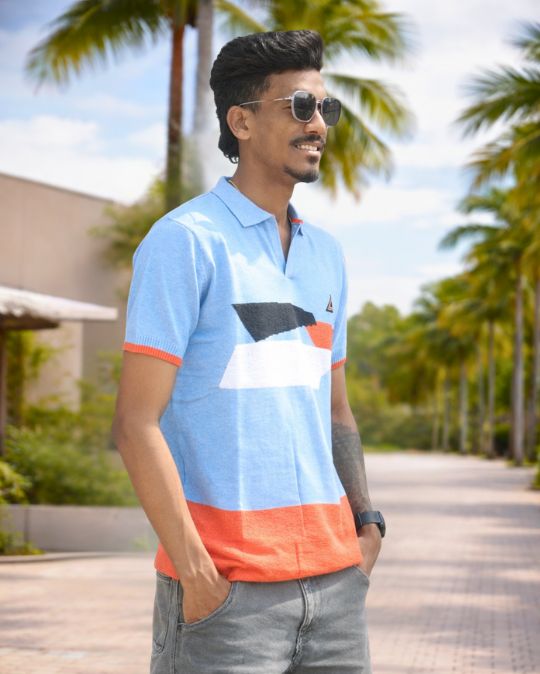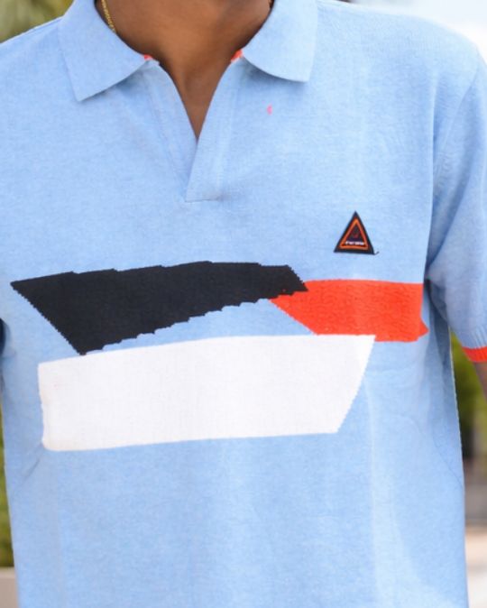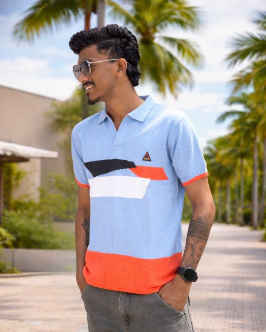 Premium men’s polo t-shirt in sky blue shade with stylish color block panels on the front. Designed with soft textured fabric, ribbed collar, and contrast sleeve edges for a smart casual look. Ideal for daily wear and weekend outings.